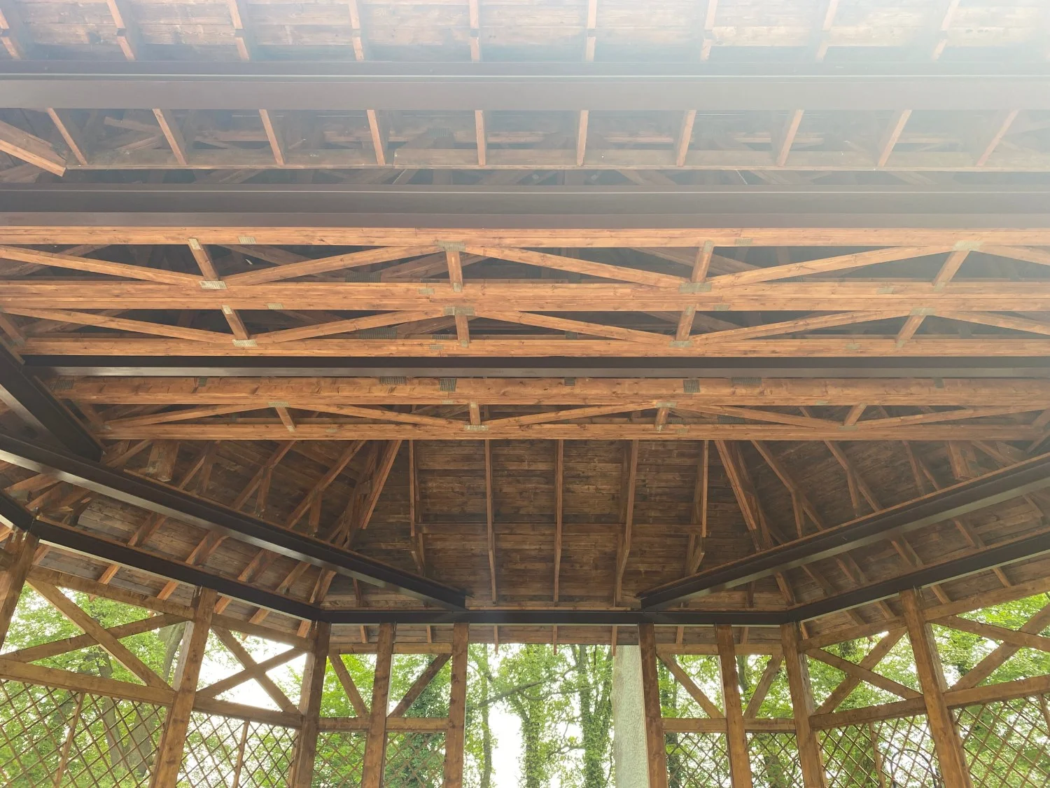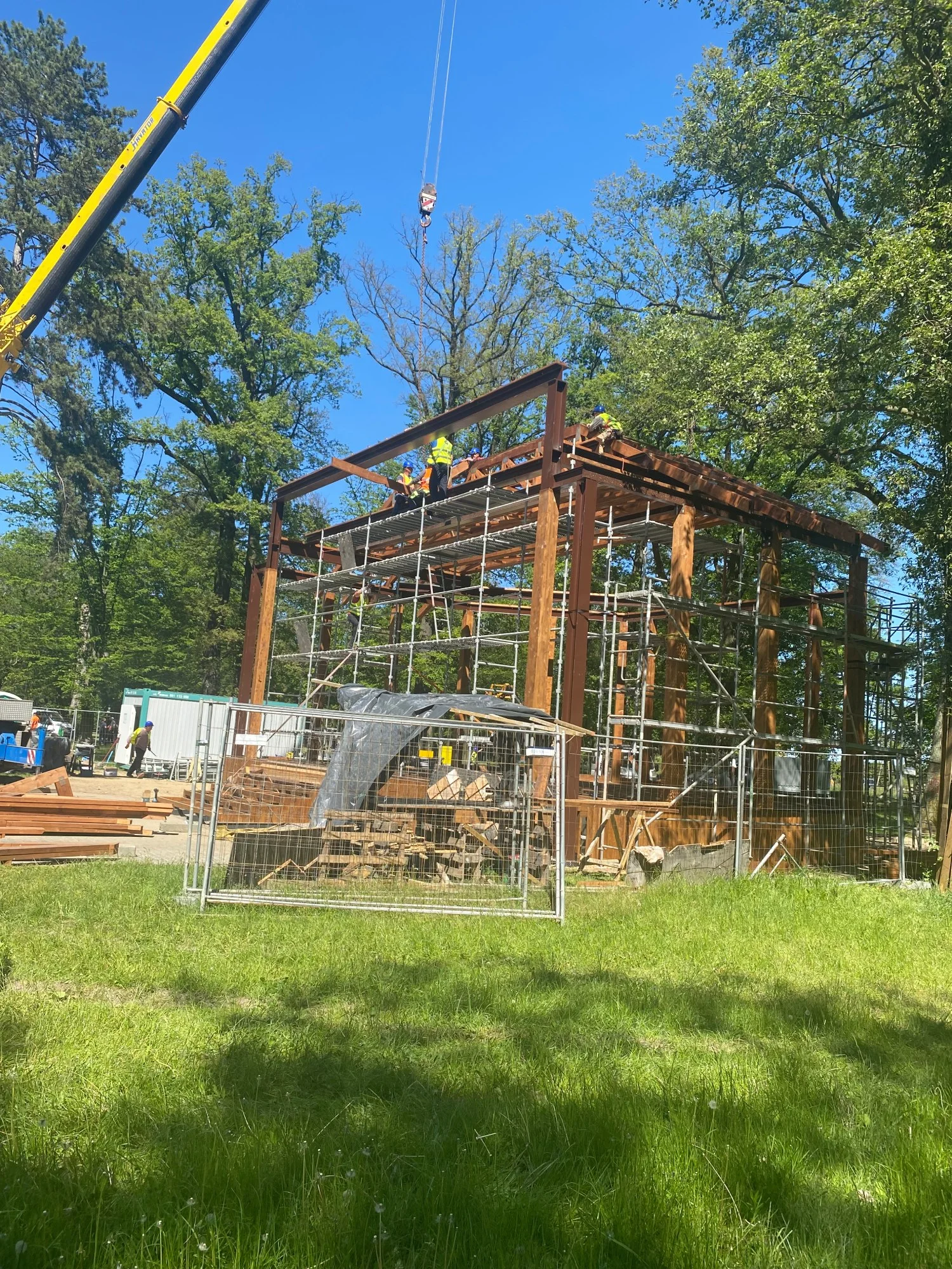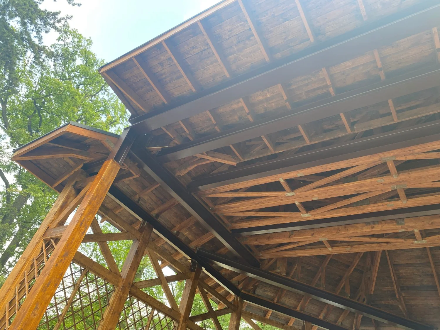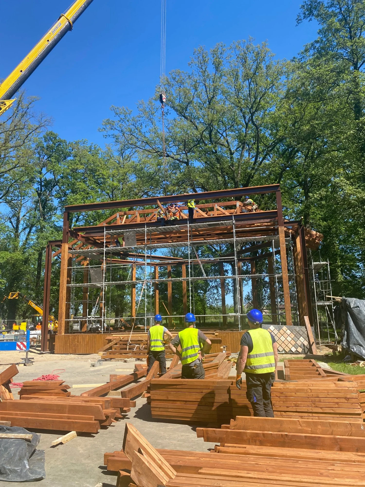 - montaż konstrukcji nośnej z drewna klejonego, wzmacnianej stalowymi elementami konstrukcyjnymi dla zapewnienia odpowiedniej wytrzymałości i trwałości,