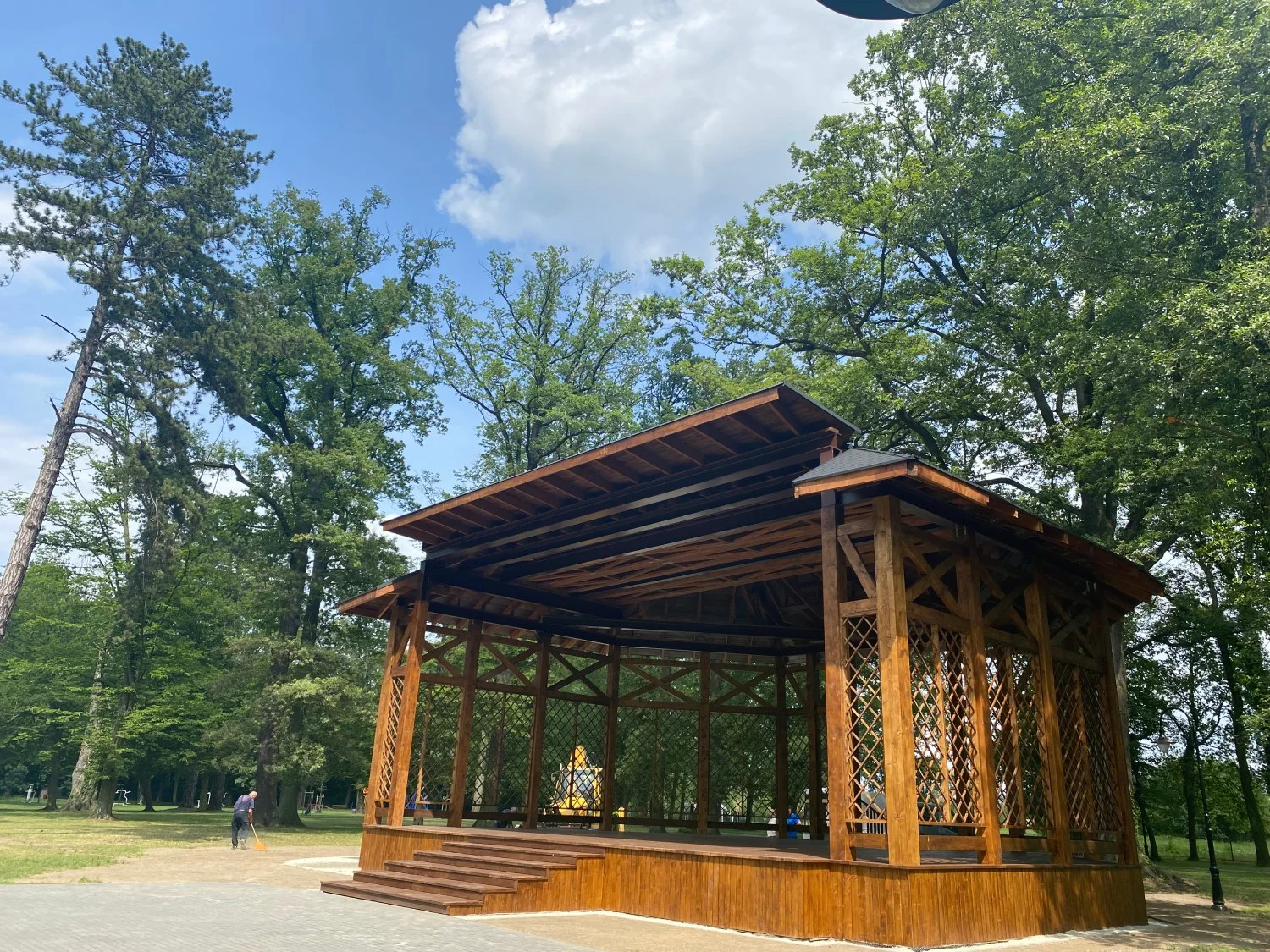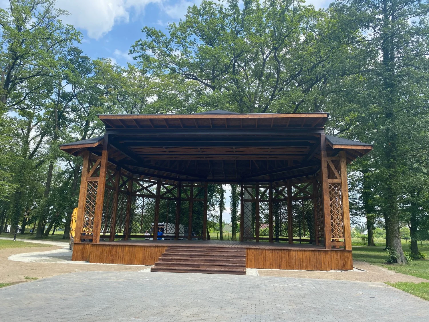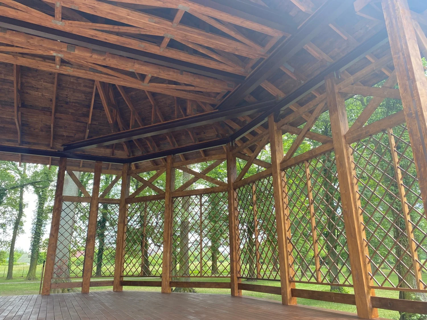 - zastosowanie ażurowych ścianek bocznych z drewnianą kratownicą, które zapewniają przewiewność i estetyczny wygląd, a jednocześnie umożliwiają ekspozycję sceny z różnych kierunków,