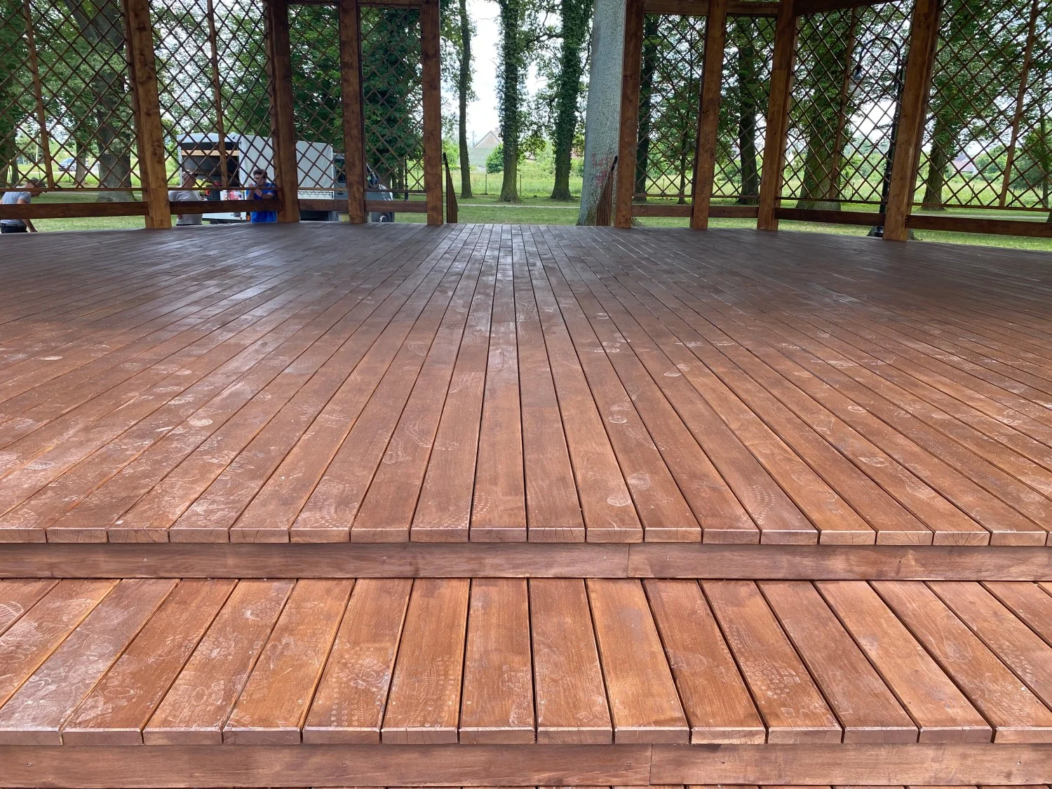 budowę sceny na planie zbliżonym do półokręgu, z podestem drewnianym z desek ryflowanych,
